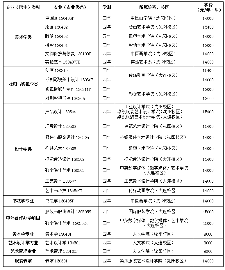 发布人:管理员鲁迅美术学院前身是1938年由毛泽东、周恩来等老一代国家领导人在延安发起并创建的鲁迅艺术学院,是“新中国美术的摇篮”,毛泽东同志亲笔题写了校名和“紧张、严肃、刻苦、虚心”的校训。经过80余年的发展,鲁迅美术学院现已成长为师资力量雄厚、专业齐全、办学水平和整体实力居全国同类院校前列,具有鲜明的办学特色,在国内外有重要影响力的著名高等艺术学府。学校办学类型:公办普通高等学校;办学层次:本科;办学形式:全日制。学校现有沈阳和大连两个校区,沈阳校区地处东北政治经济文化中心的高新产业街区三好街,大连校区地处美丽的国家风景旅游度假区金石滩。中国画、书法学、文物保护与修复、绘画、雕塑、公共艺术、摄影、影视摄影与制作、戏剧影视导演、环境设计、产品设计、服装与服饰设计、表演、美术学、艺术管理、实验艺术,在沈阳校区办学;视觉传达设计、工艺美术、数字媒体艺术、动画、戏剧影视美术设计、艺术与科技、艺术设计学、服装与服饰设计(中日合作办学)、数字媒体艺术(中英合作办学),在大连校区办学。学校是辽宁省重点支持的国内一流大学建设单位,中国画、绘画、雕塑、产品设计、视觉传达设计、动画、摄影、环境设计、服装与服饰设计、工艺美术专业被评为国家级一流本科专业建设点;数字媒体艺术专业被评为省级一流本科专业建设点。学校与国际上30余所艺术院校建立了友好校际关系,并经教育部批准,分别与日本文化学园文化服装学院、英国索尔福德大学开展合作办学。