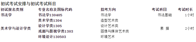复试:“书法学”专业初试合格考生按书法学专业参加复试;“美术学与设计学类”初试合格考生可从(造型艺术类、设计艺术类、图像与媒体艺术类、环境艺术)选择填报二个招考专业(类)参加复试。