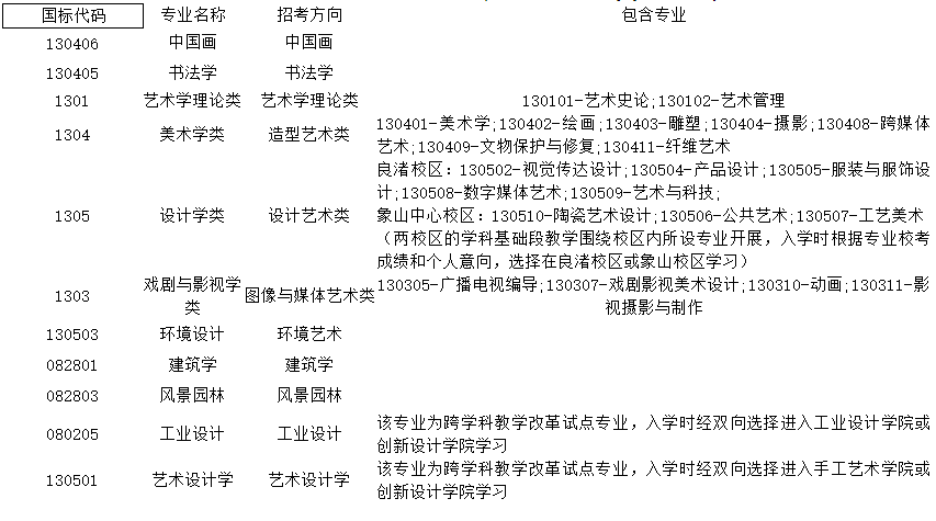 中国美术学院专业教学为基础和专业「两段式」教学模式,各招考专业大类包含专业见下表: