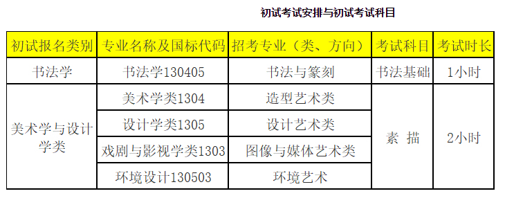 初试:考生可在初试报名类别“中国画”、“书法学”、“美术学与设计学类”中选择一个报名。其中:“书法学”、“美术学与设计学类”参加初试,“中国画”专业直接参加复试。